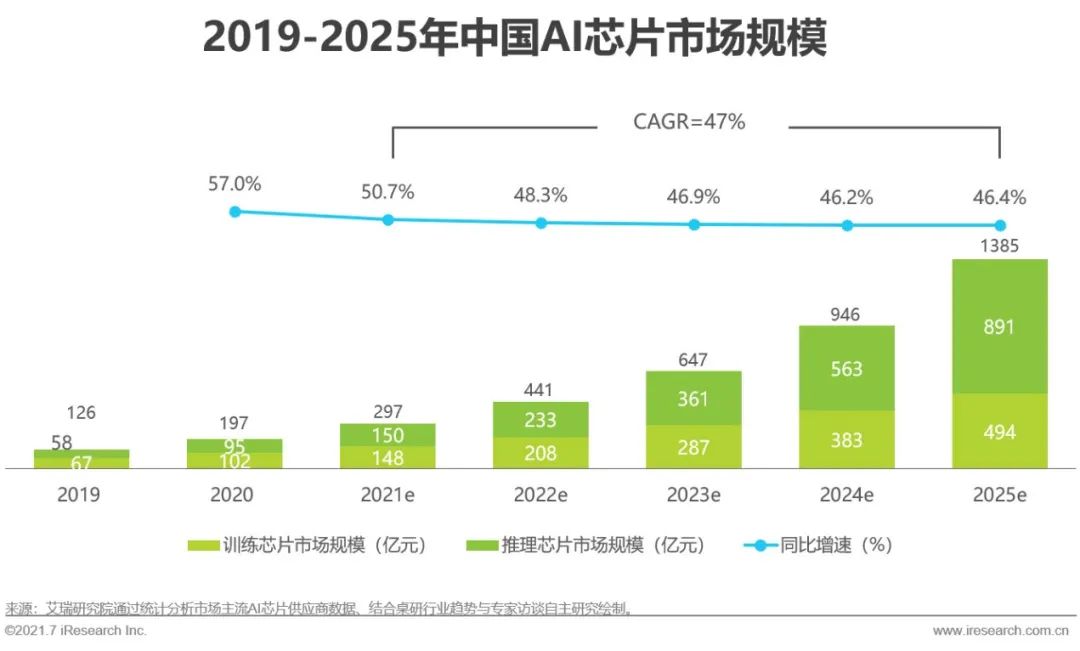 AI芯片是人工智能产业的关键硬件,也是AI加速服务器中用于AI训练与推理的核心计算硬件,被广泛应用于人工智能、云计算、数据中心、边缘计算、移动终端等领域。当前,我国的AI芯片行业仍处于起步期,市场空间有待探索与开拓。据艾瑞统计与预测,2020年我国AI芯片市场规模为197亿元,到2025年,我国AI芯片市场规模将达到1385亿元,2021-2025年的相关CAGR=47%,市场整体增速较快。从AI芯片的计算功能来看,一开始,因AI应用模型首先要在云端经过训练、调优与测试,计算的数据量与执行的任务量数以万计,故云端训练需求是AI芯片市场的主流需求。而在后期,训练好的AI应用模型转移到端侧,结合实时数据进行推理运算、释放AI功能,推理需求逐渐取代训练需求,带动推理芯片市场崛起。2025年,云端推理与端侧推理成为市场规模增长的主要拉动力,提升了逐渐下滑的AI芯片市场规模同比增速。