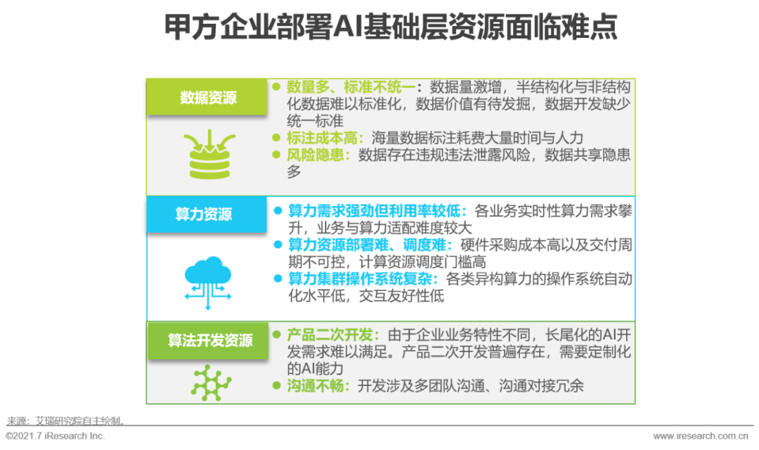 根据艾瑞2020年执行的CTO调研,2019年超过51%的样本企业AI相关研发费用占总研发费用比重在10%以上,2020年65.9%的企业AI研发占比达到10%以上。一方面是甲方企业不断增长的对智能化转型的强劲需求,一方面则是在AI应用开发与部署过程中企业普遍面临的数据质量(49%)、技术人才(51%)等基础资源配置难点。且目前只有少数企业可以完成AI项目实施前设定的全部投资回报率(ROI)标准,因此甲方企业在投资AI项目时相对审慎。AI基础层资源则可有效缓解甲方利用AI技术重塑自身业务时的投资矛盾,提升模型生产效率,降低部署成本:数据资源集群具备数据采标与数据治理能力,且一站式的数据平台可对实时数据进行统一管理,提高数据利用率;高效的AI算力集群与调度系统可满足模型训练与推理需求,降低总拥有成本(TCO,TotalCost of Ownership);基于算法开发平台演化出的语音识别、计算机视觉、机器学习等专业的AI模型生产平台,可提供高效、一站式的AI模型生产服务。